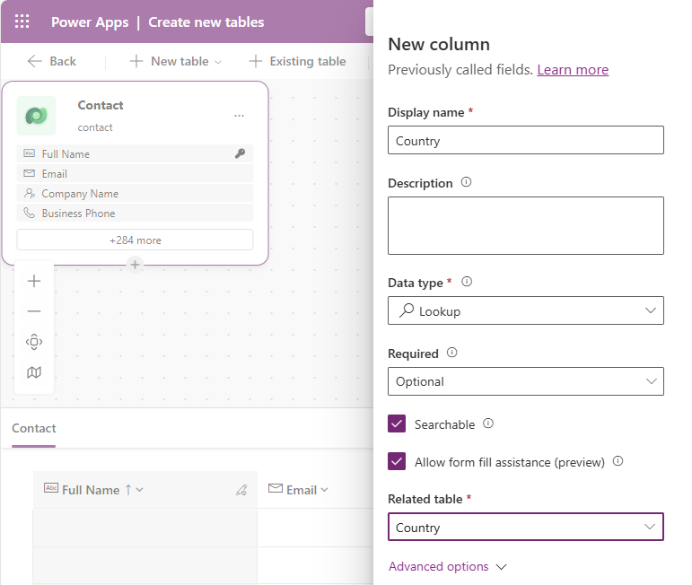 - Add a lookup column that references the Country/region table. This step creates the relationship needed for filtering.