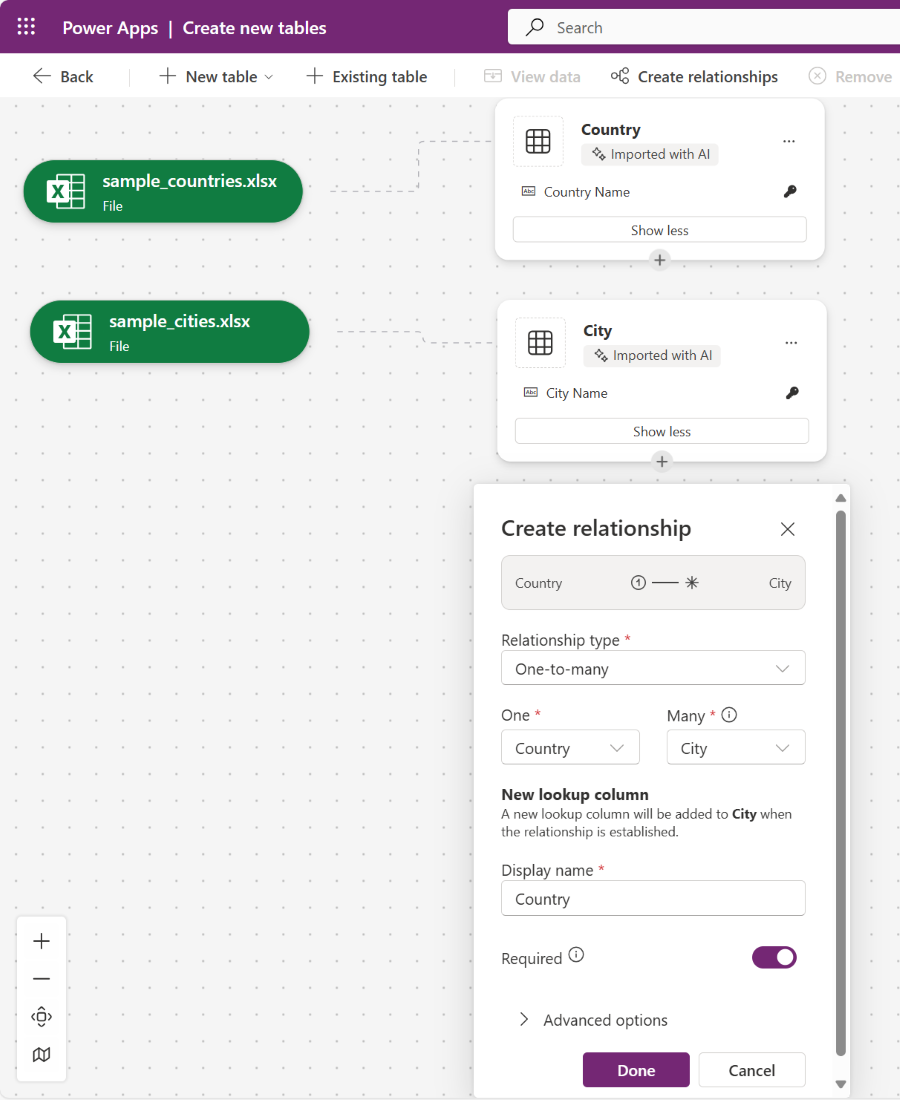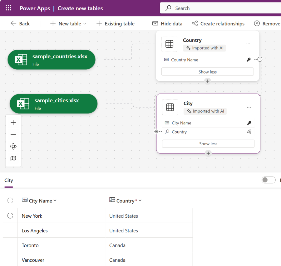 - Use Excel import, Power Automate, or manual entry in Power Apps to add records to both tables.