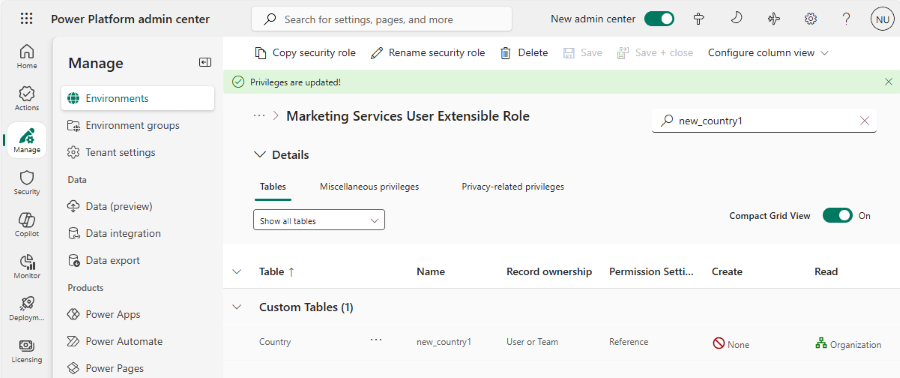 - Add read permission for the Marketing Services User Extensible Role so it can access the country/region and city entities.