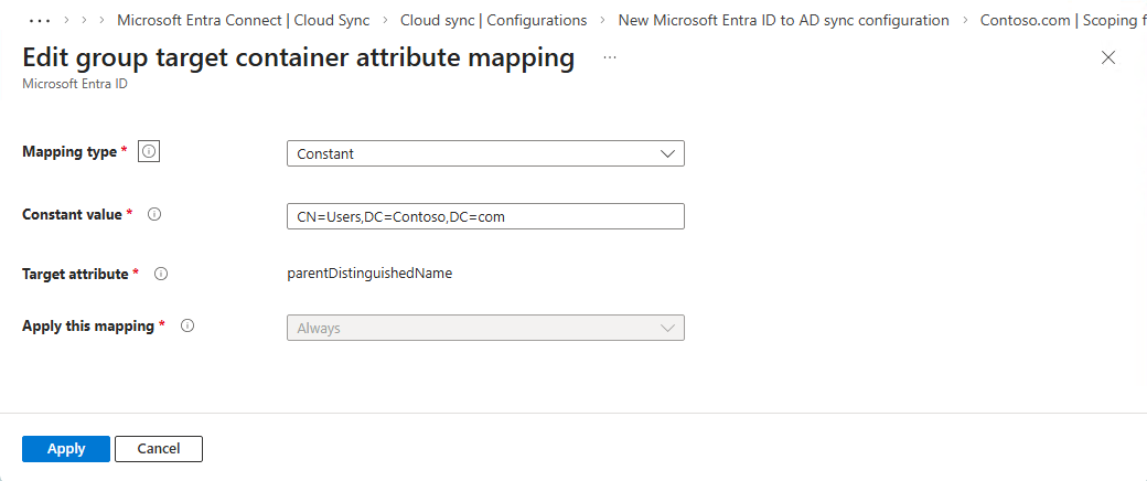 OU=Groups,DC=contoso,DC=com.Select Apply. The target container changes depending on the group displayName attribute.