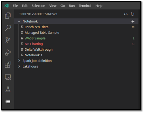 - Default: White text and no character to the right of the notebook name indicates the default or initialized state. The notebook exists in the remote workspace and isn't downloaded to your local VS Code.