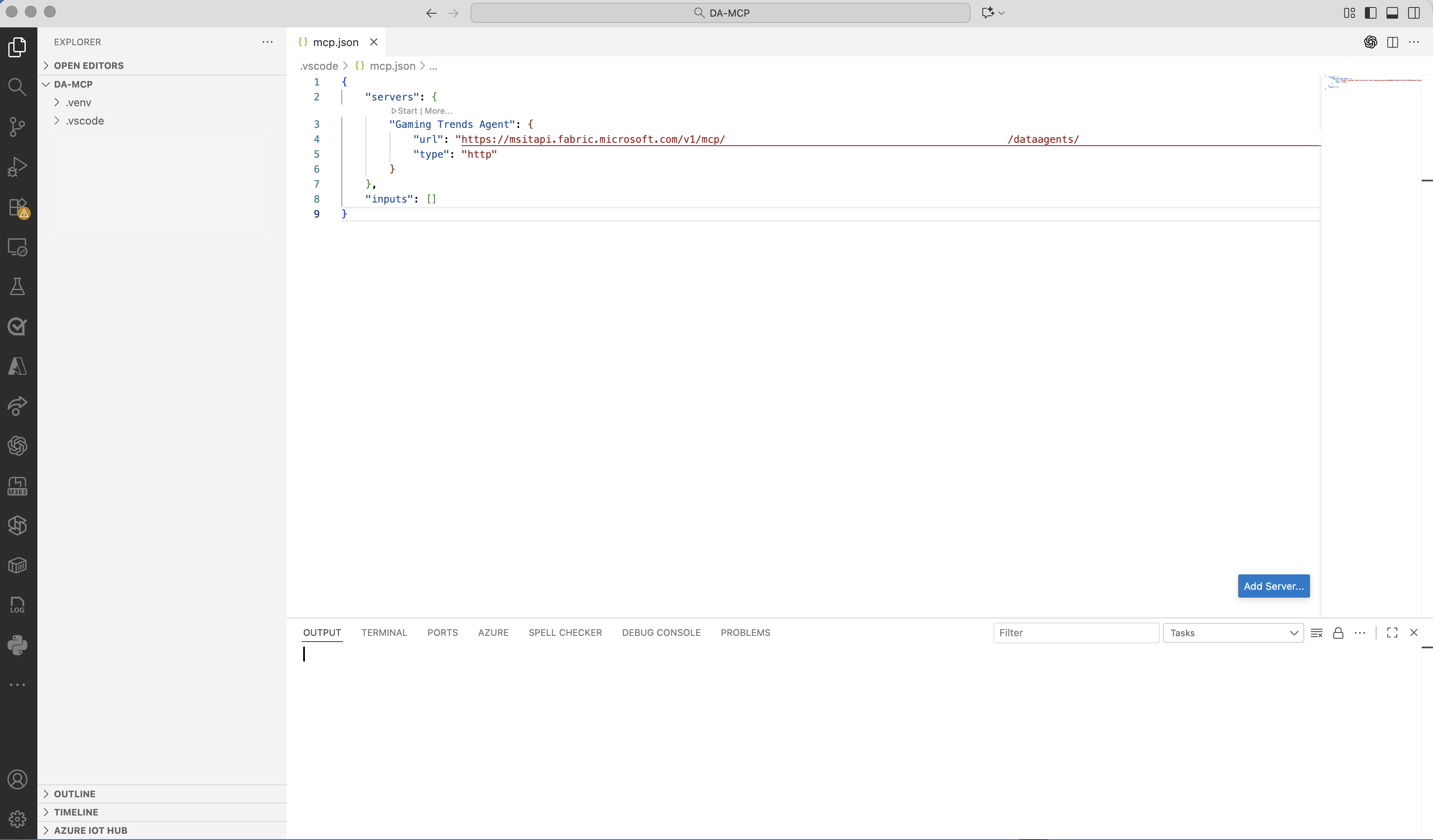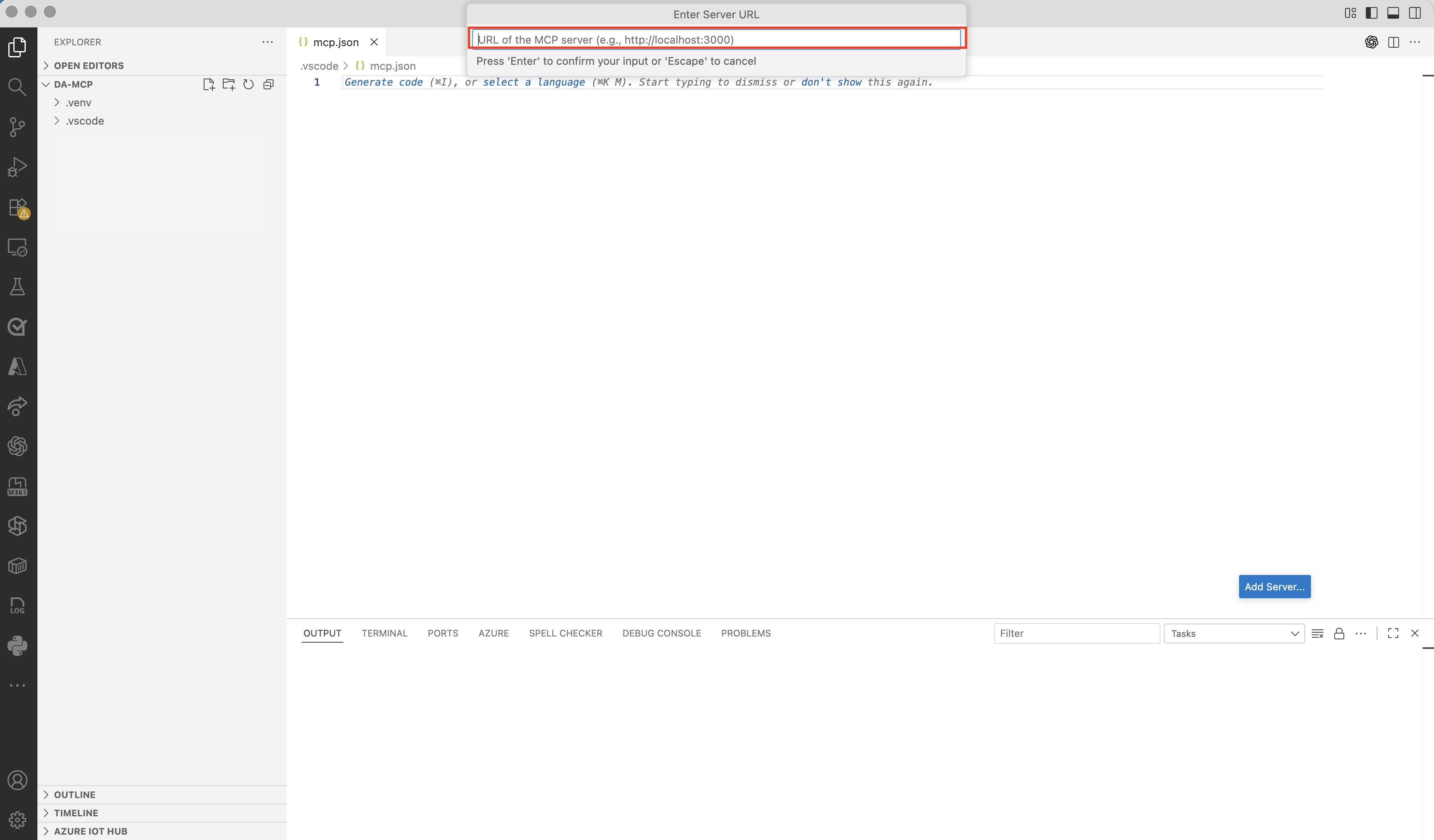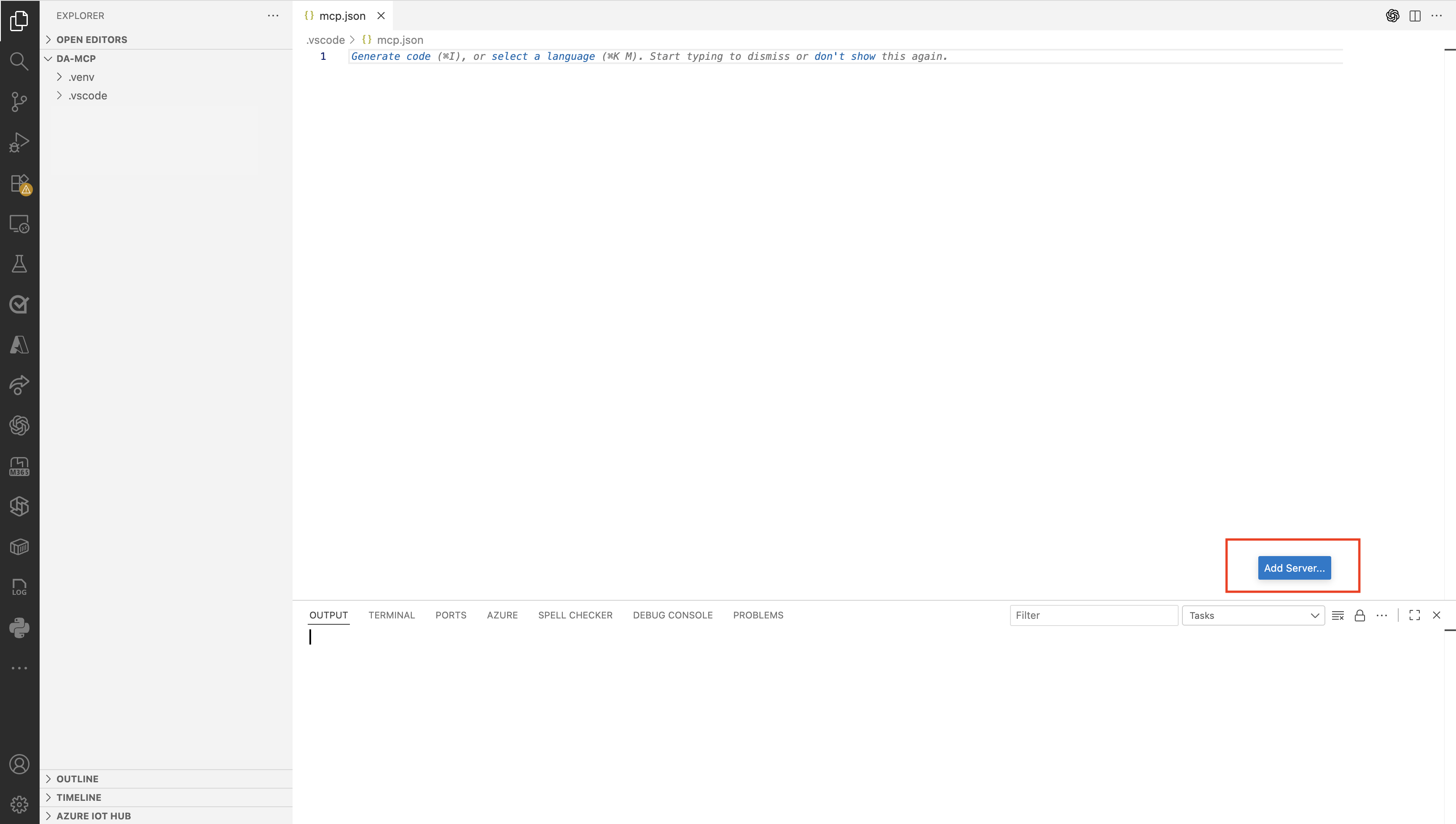 mcp.json.VS Code automatically displays a blue Add Server button at the bottom right of the window.