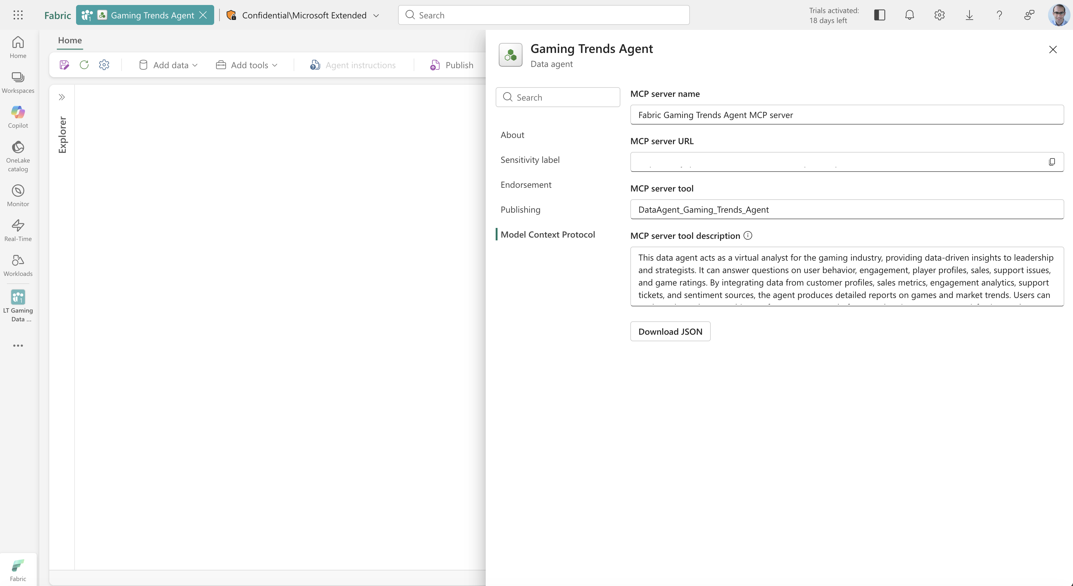 To get started, after publishing the data agent, go to the Settings of the agent and open the Model Context Protocol tab. Here you see the following information: