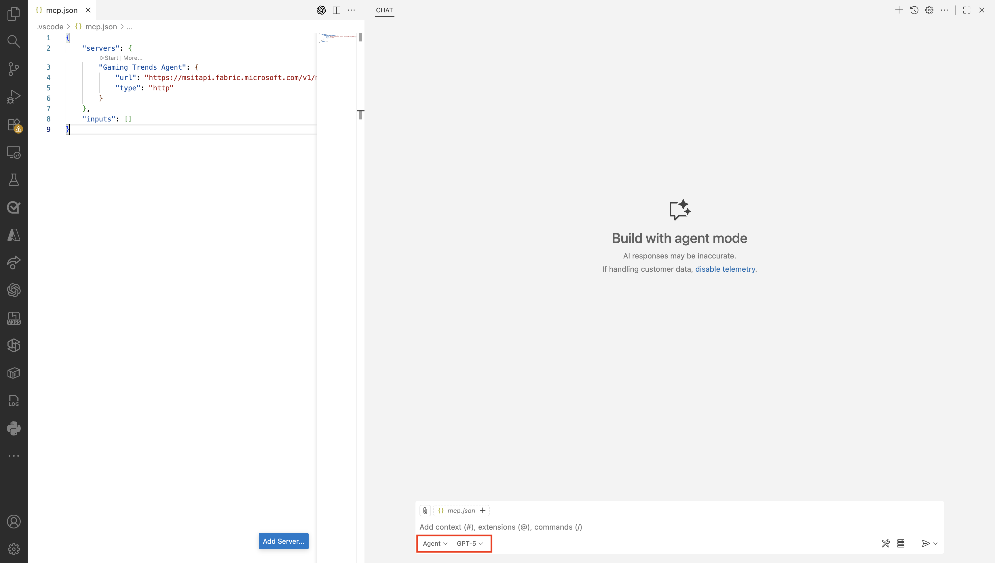 After adding the MCP server, enable Agent Mode in VS Code. Agent Mode lets VS Code act as an orchestrator interface, connecting your editor with MCP servers to interact with external tools like the Fabric data agent. To enable it: