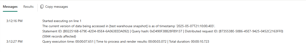 When a T-SQL query is run, information about the current version of the data being accessed is included. For example, you can see the timestamp in the Messages of the Fabric portal query editor:
