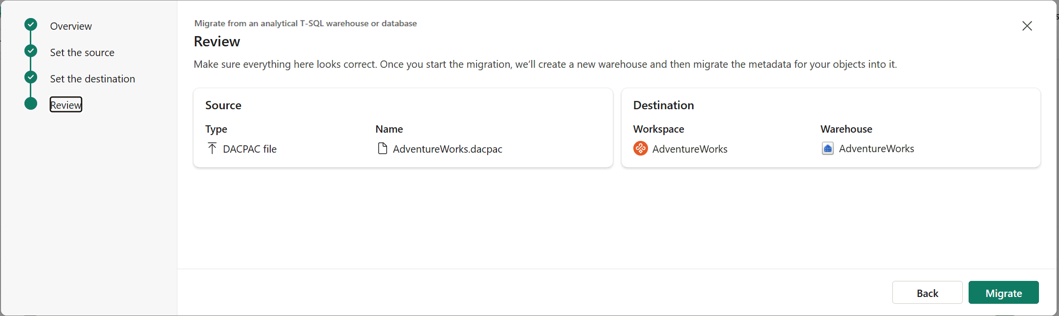Review your inputs and select Migrate. The Migration Assistant creates a new warehouse item and starts the metadata migration.