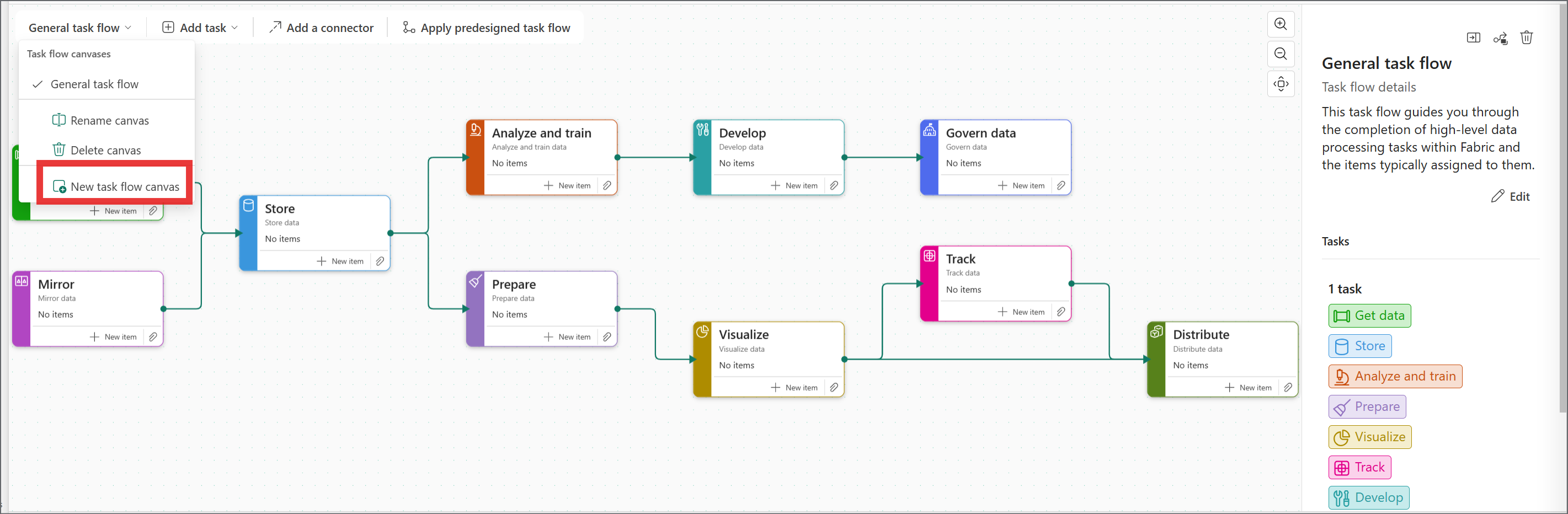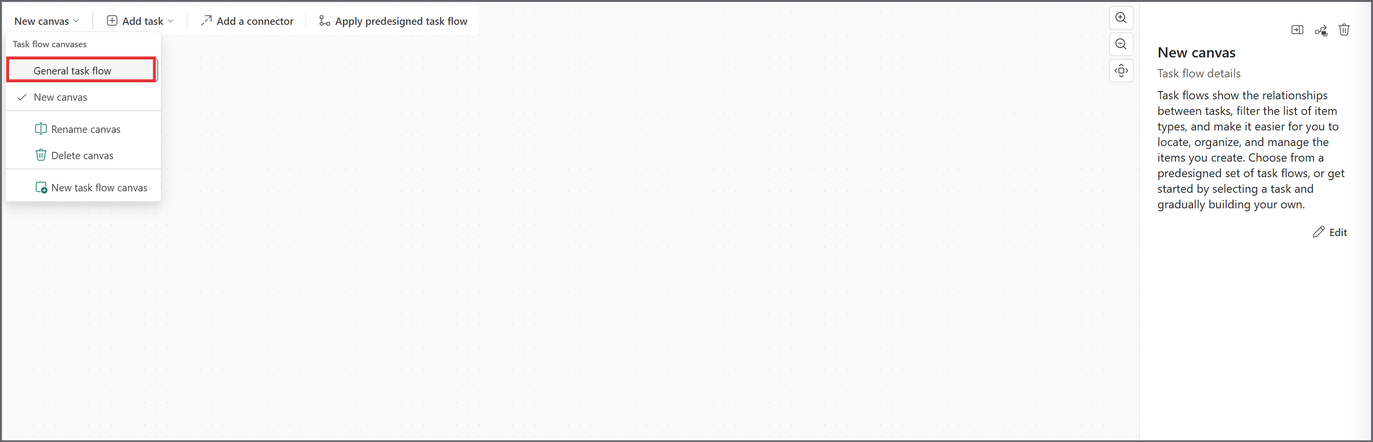 The new canvas appears in the canvas selector and opens on the task flow area.