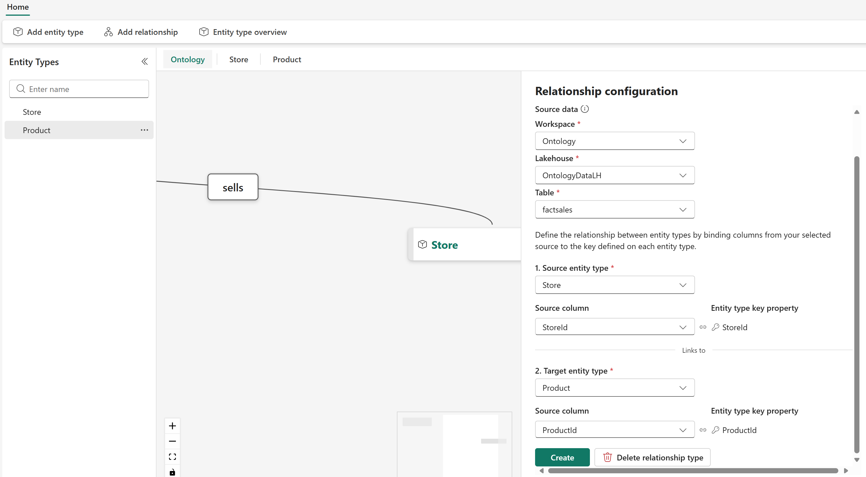The first step in adding a relationship in your ontology (preview) item is creating a relationship type. Then, bind data to the relationship type to create relationship instances.