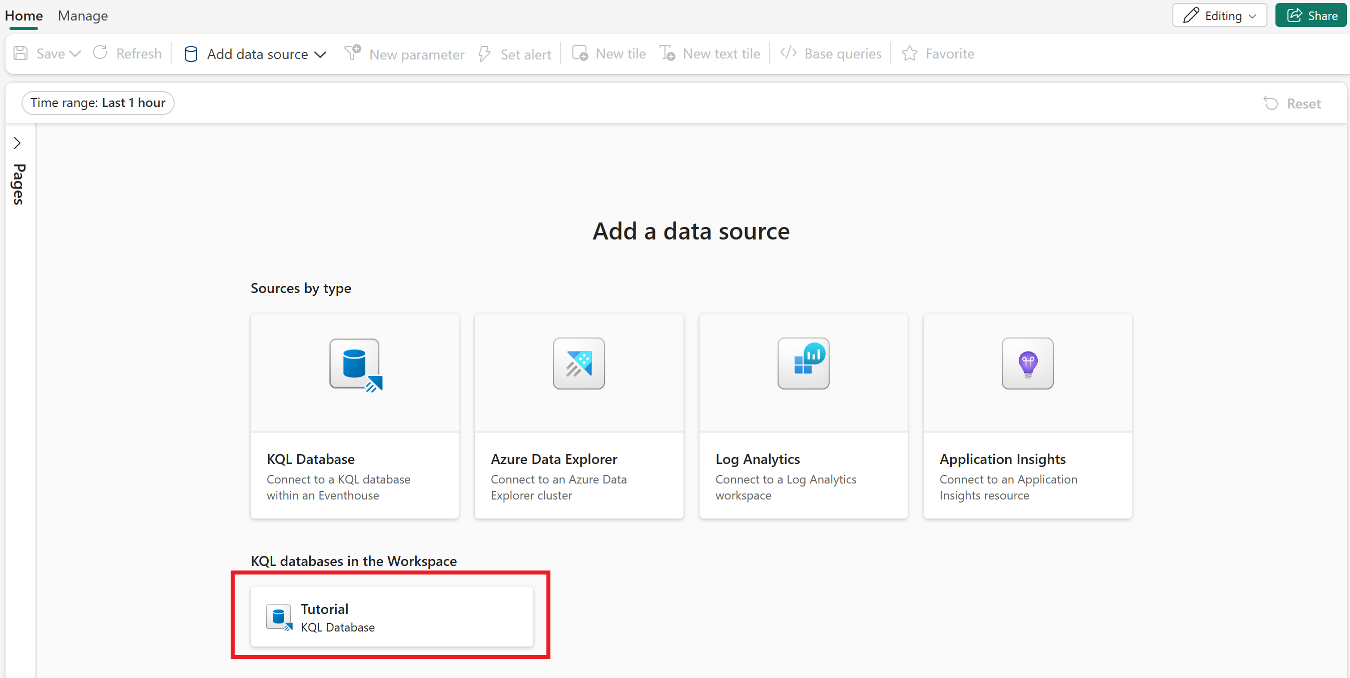Dashboard options can't be accessed until the dashboard is connected to some data source. Add an initial data source by selecting the Tutorial KQL database where it's visible on the canvas.