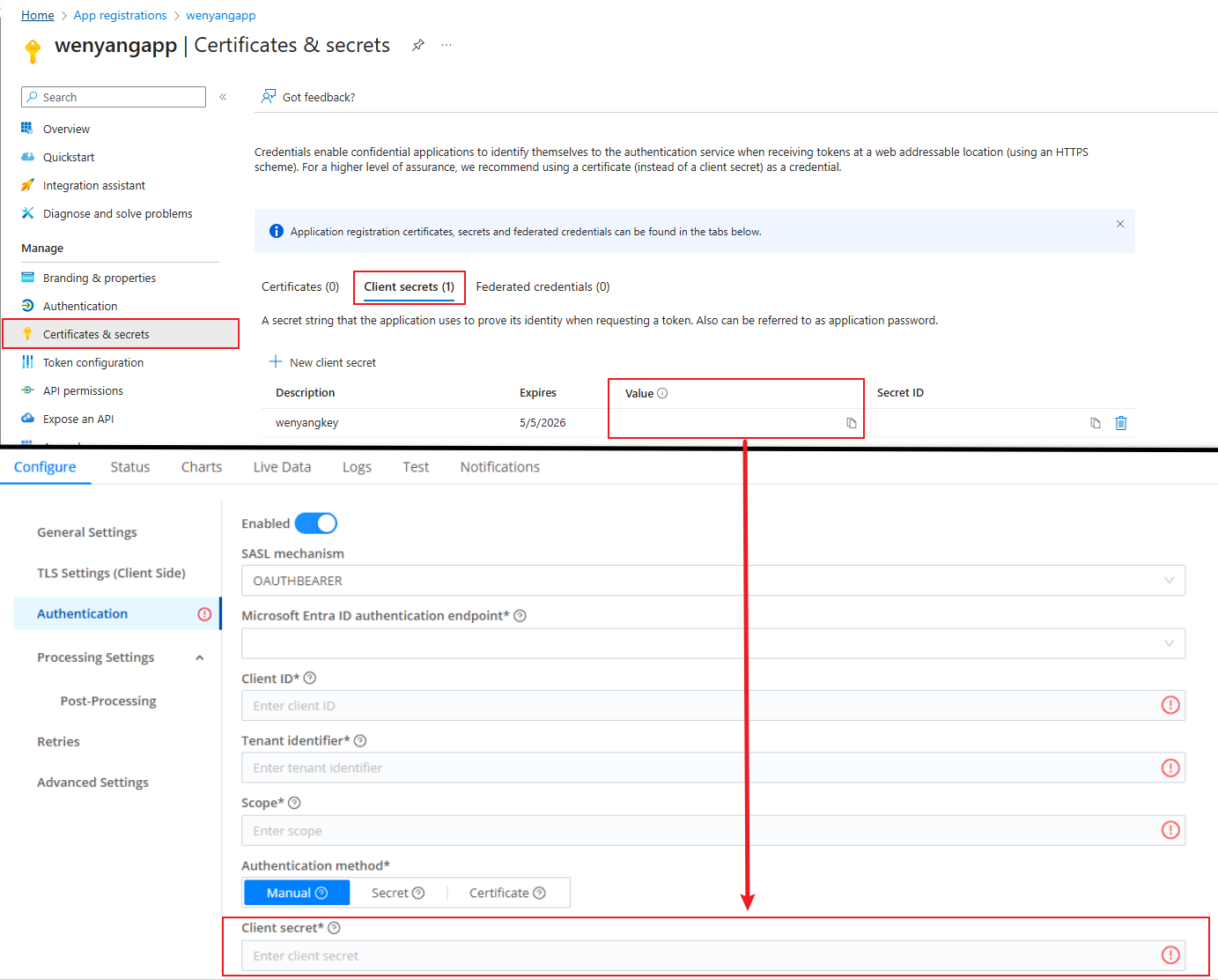 Go to Certificates & secrets and copy the Client secrets value into the Client secret field on the Authentication page.