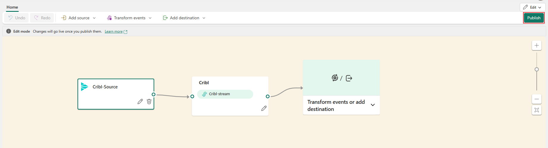 After you create the Cribl source, it's added to your eventstream on the canvas in edit mode. To implement the newly Cribl data source, select Publish.