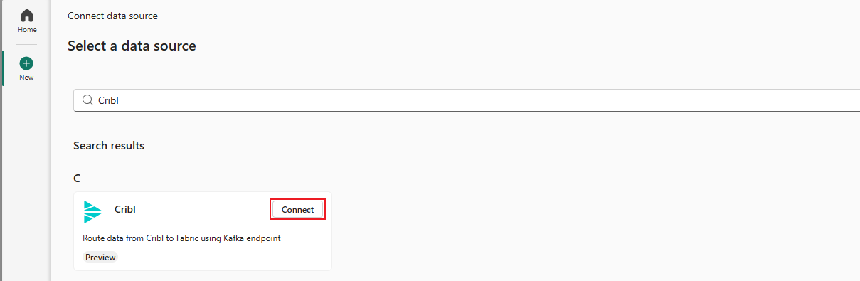 On the Select a data source page, search for and select Connect on the Cribl tile.