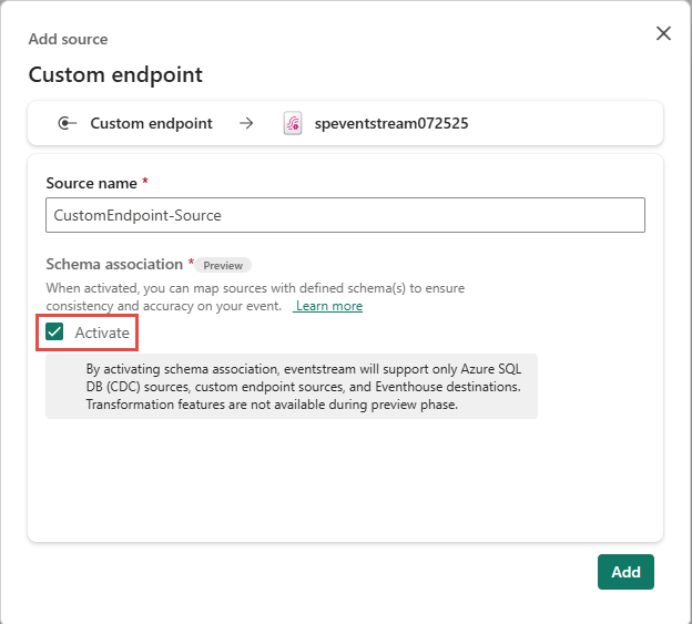 In the Custom endpoint dialog, enter a name for the custom source under Source name, and then select Add.