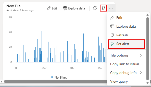 From the new bar chart tile, select the Alert icon. Or, from the More options (three dots) menu, select Set Alert.
