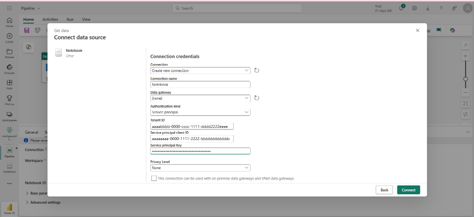 @pipeline().parameters.notebookIdIn the pipeline parameters, input the actual notebook ID from the restricted workspace.