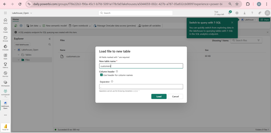 Under the Tables folder, upload the Delta table you want to use. This example uses the customers table.