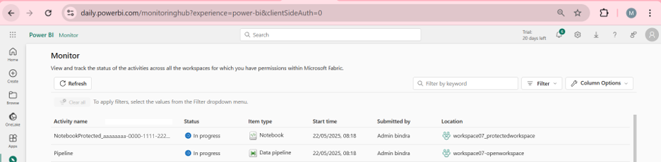 Wait for the run status to complete. You can check the status in the Monitor page in the Microsoft Fabric portal.