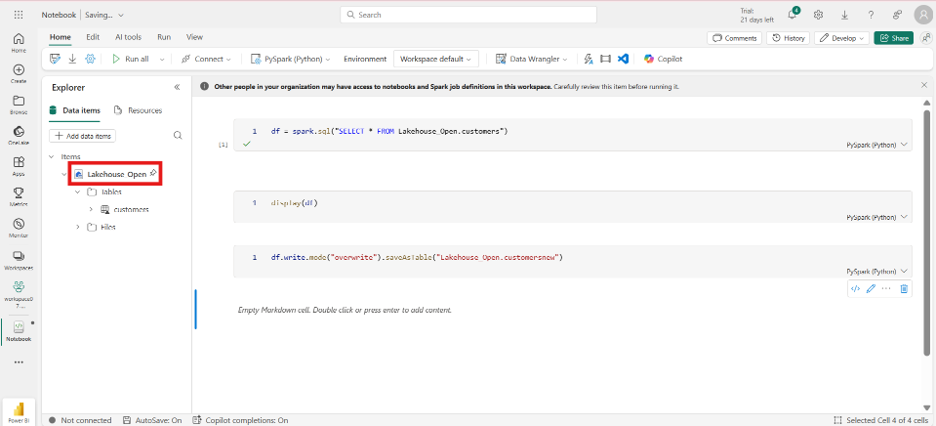 df = spark("SELECT * FROM Lakehouse_Open.customers") display(df) df.write.mode("overwrite").saveAsTable("Lakehouse_Open.customersnew")Save the Notebook.