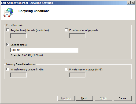 On the Recycling Conditions page of the Edit Application Pool Recycling Settings Wizard, select at least one of the options in the Fixed Intervals section, type values into the appropriate text boxes, and then click Next.