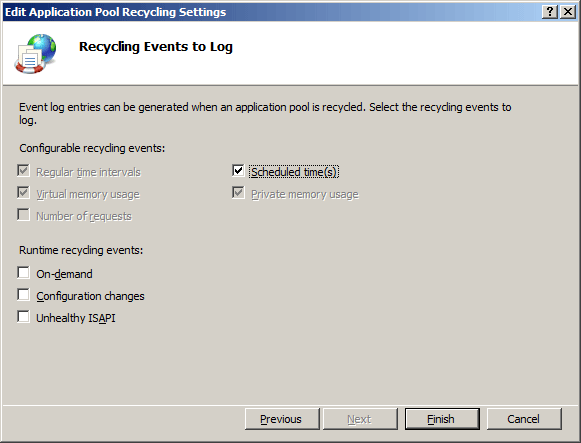 (Optional) On the Recycling Events to Log page of the Edit Application Pool Recycling Settings Wizard, select the configurable recycling events and run-time recycling events that you want IIS to send to the event log when they occur, and then click Finish.