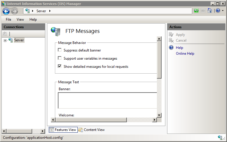 appcmd.exe set config -section:system.applicationHost/sites /siteDefaults.ftpServer.messages.bannerMessage:"Welcome!" /siteDefaults.ftpServer.messages.allowLocalDetailedErrors:"True" /commit:apphost