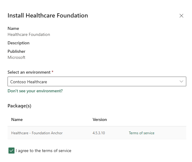 In the Install Healthcare Foundation pane, select the target environment for installation. Agree to the terms of service and select Install.