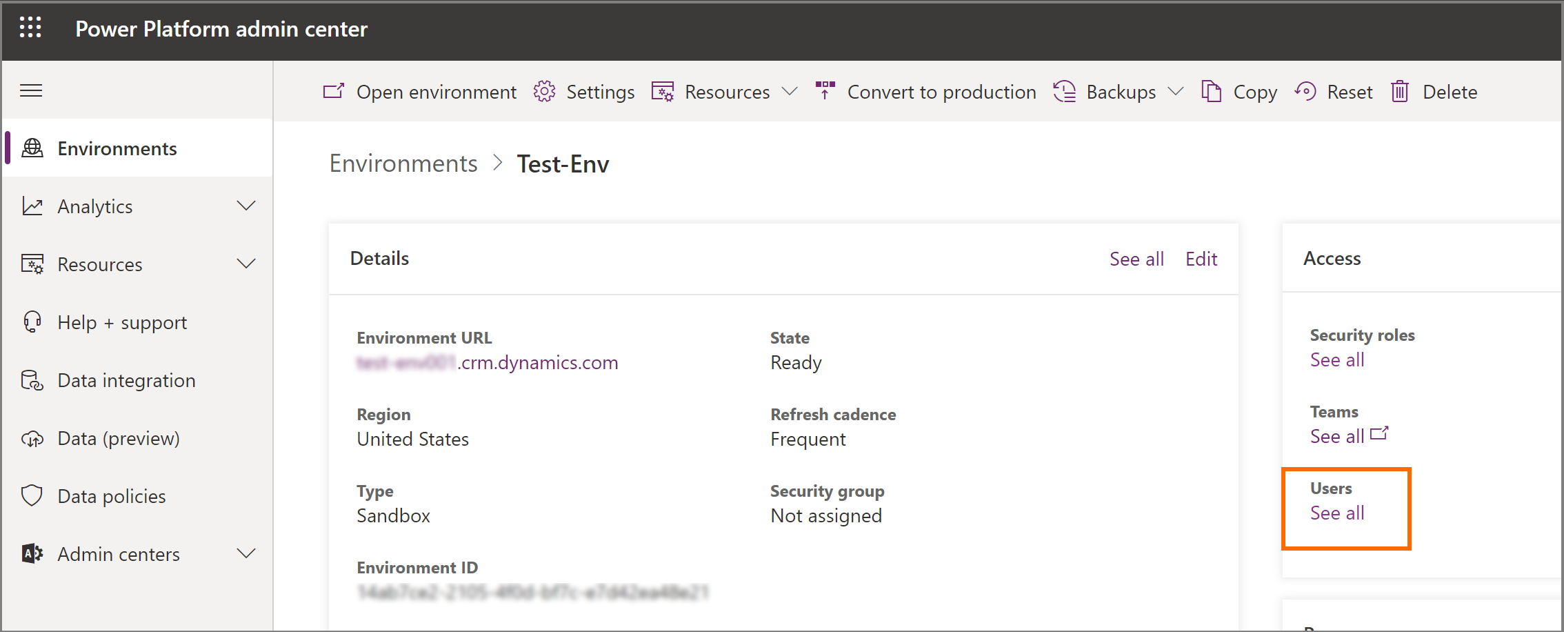 Select your environment, and then select See all under Users.