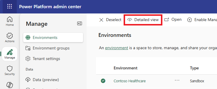 Select your environment and select Detailed view on the toolbar.