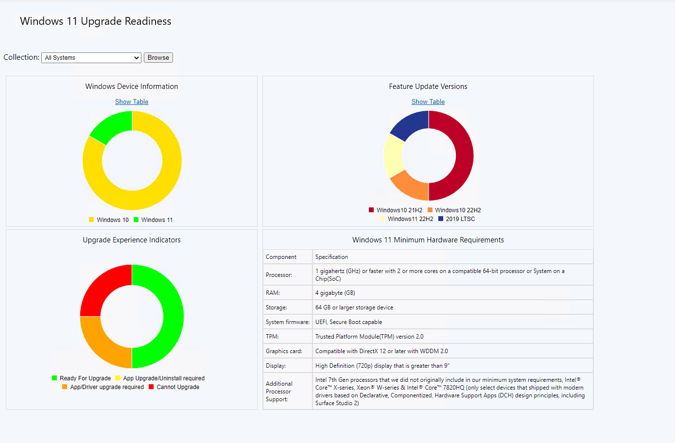 Administrators can use this dashboard to devise their Windows 11 upgrade strategy and discover the devices in the organization, which are ready for Windows 11 Upgrade. This Dashboard also provides a count by installed Feature update version and a view of all Windows devices inside the organization. Administrators can create a collection of Windows 11 ready for upgrading devices and roll out feature updates to them.