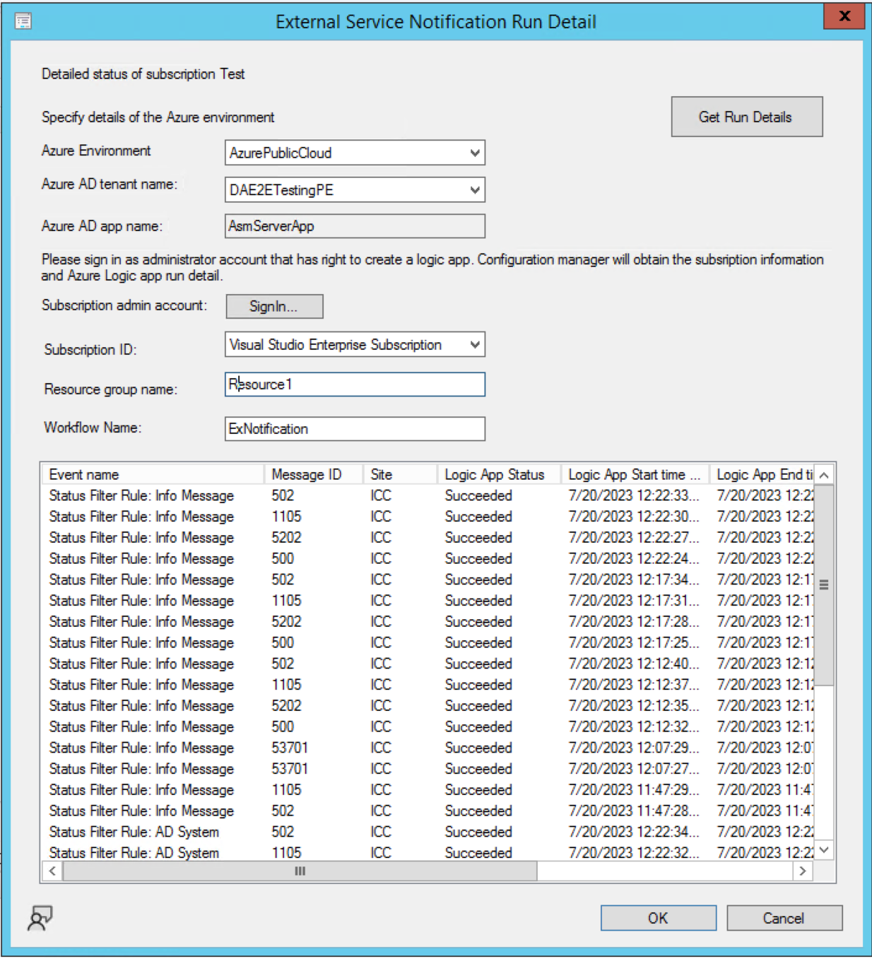 External service notification Run details from Azure Logic application