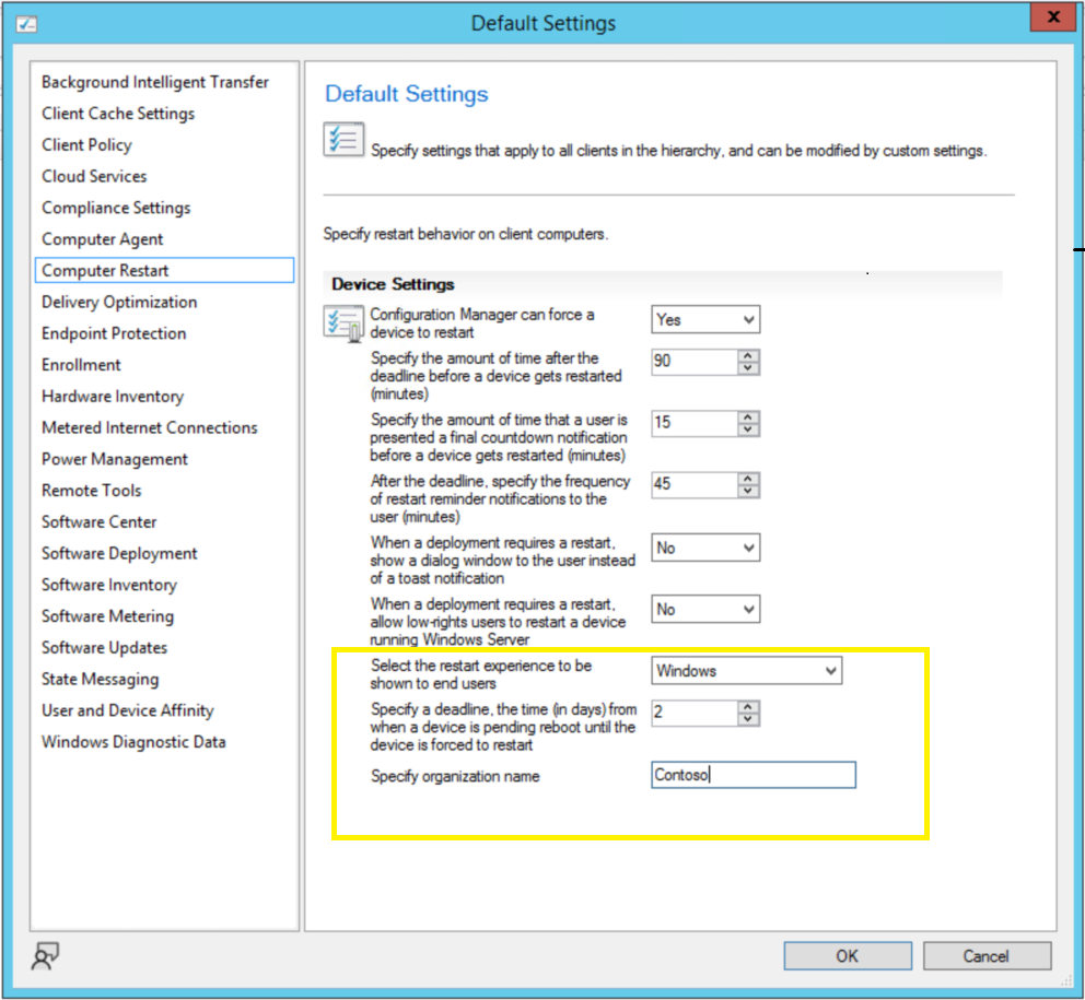 When installing software updates from Configuration Manager, administrators can now choose to use the native Windows Update restart experience. To use this feature, client devices must be running Windows build 22H2 or later. From the Computer Restart client device settings, ensure that Windows is selected as the restart experience. Branding information will be included in the Windows restart notification for updates that require restart.