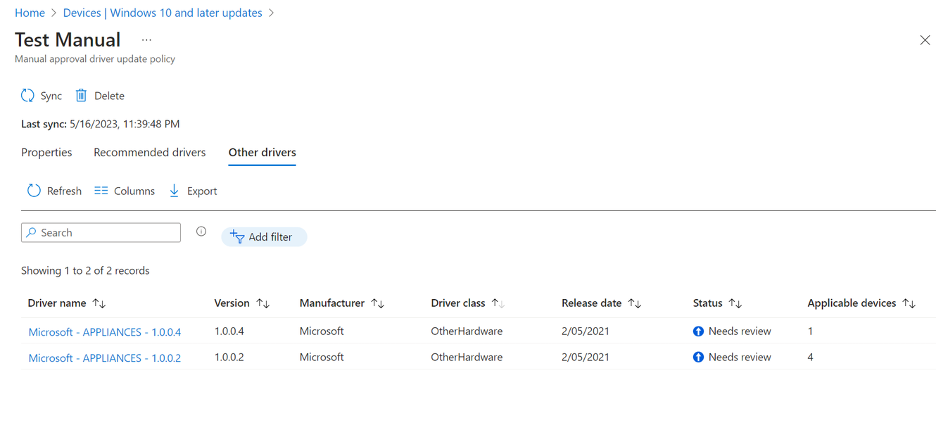 - New updates that aren't a recommended driver update are added to the other drivers list of the policy and have their status set Needs review. These updates must be manually approved before they can be deployed to a device.