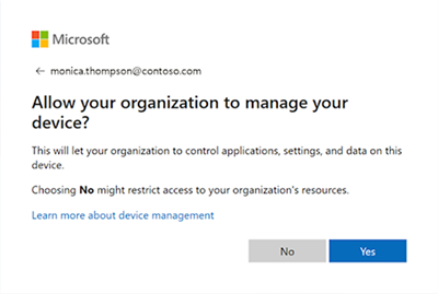 - If your organization doesn't opt to use the new property in public preview to manage the MDM option display, select No. Selecting Yes enrolls your device into Intune and won't enable MAM.