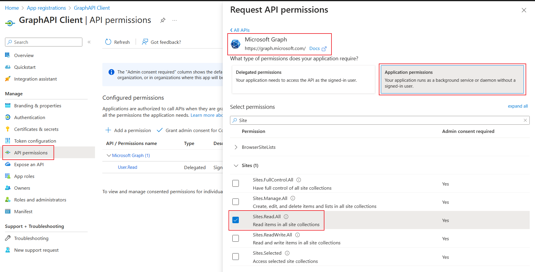 In the new application’s Request API permissions page, add the Sites.Read.All permission.