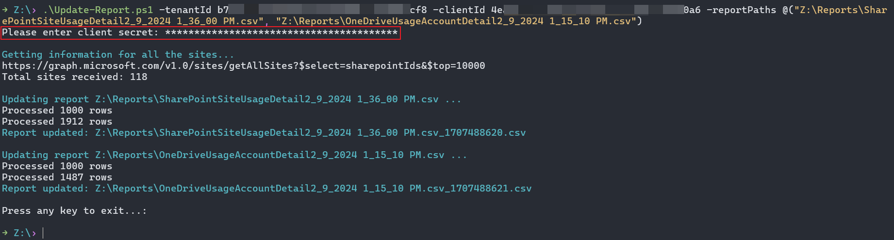 To update the reports with site URLs, execute the PowerShell script.