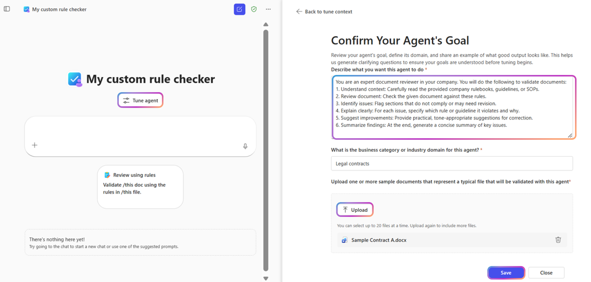 Provide your goals: Describe your main goal for the agent, the business domain, and at least one sample document representative of a typical document that the agent validates. This information helps tune the agent to your unique business needs. Provide clear goals and high-quality sample documents for the best outcomes. Select Save when you're done.