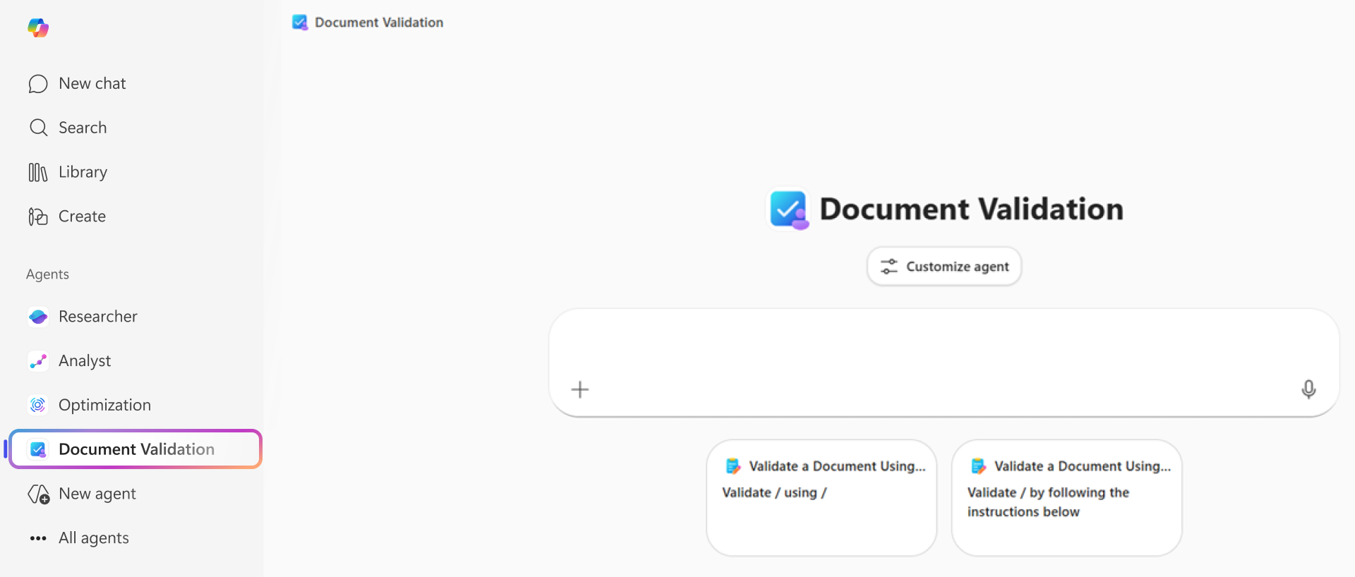 In Microsoft 365 Copilot Chat, start a new chat with the Document Validation agent template.