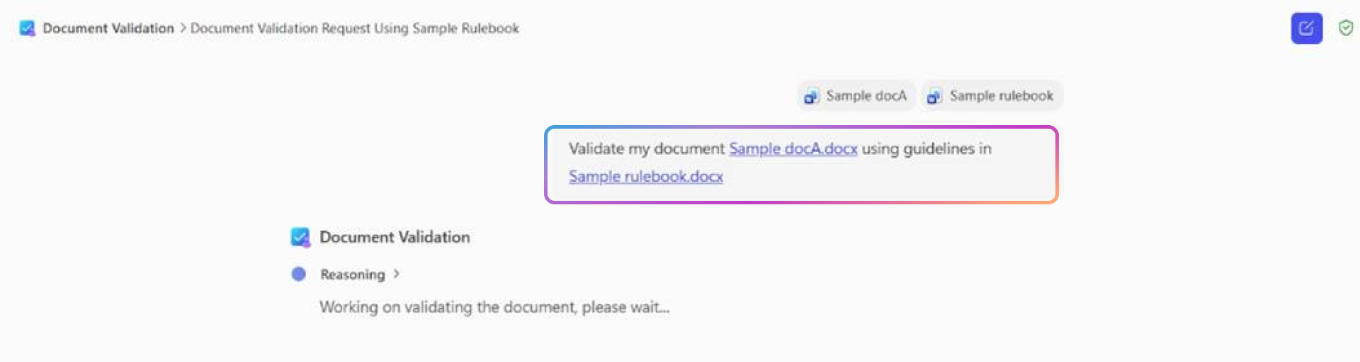- Embed your rulebooks and guidelines so the agent validates documents according to your unique standards.