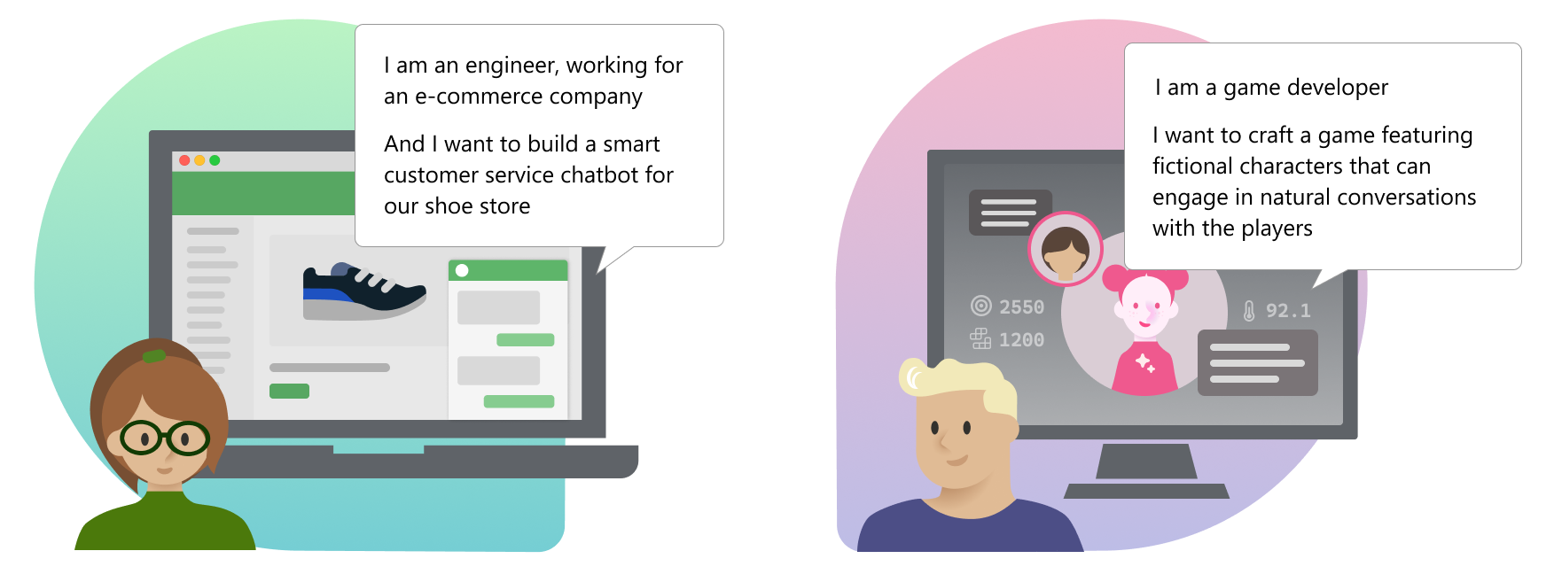 Persona 1 - I'm an engineer, working for an e-commerce company, and I want to build a smart customer service chatbot for our shoe store. Persona 2 - I'm a game developer, and I want to craft a game featuring fictional characters that can engage in natural conversations with the players.
