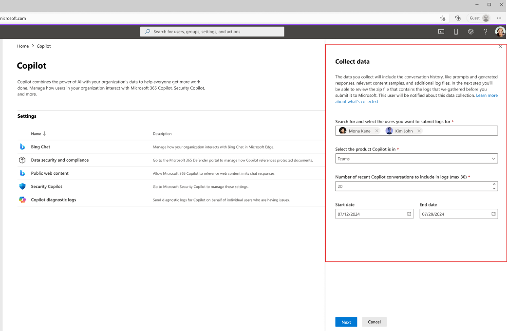 Enter the email address of the user who reported the problem. You can enter up to five users. Then, choose the relevant Copilot product from the list provided.