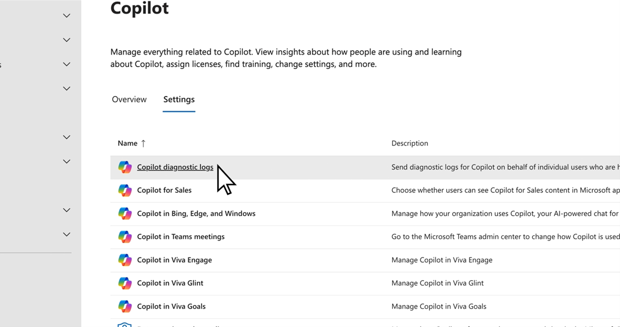 Find Copilot diagnostic logs and select it to open the Copilot feedback diagnostic logs pane. Review the information and then select Get started.