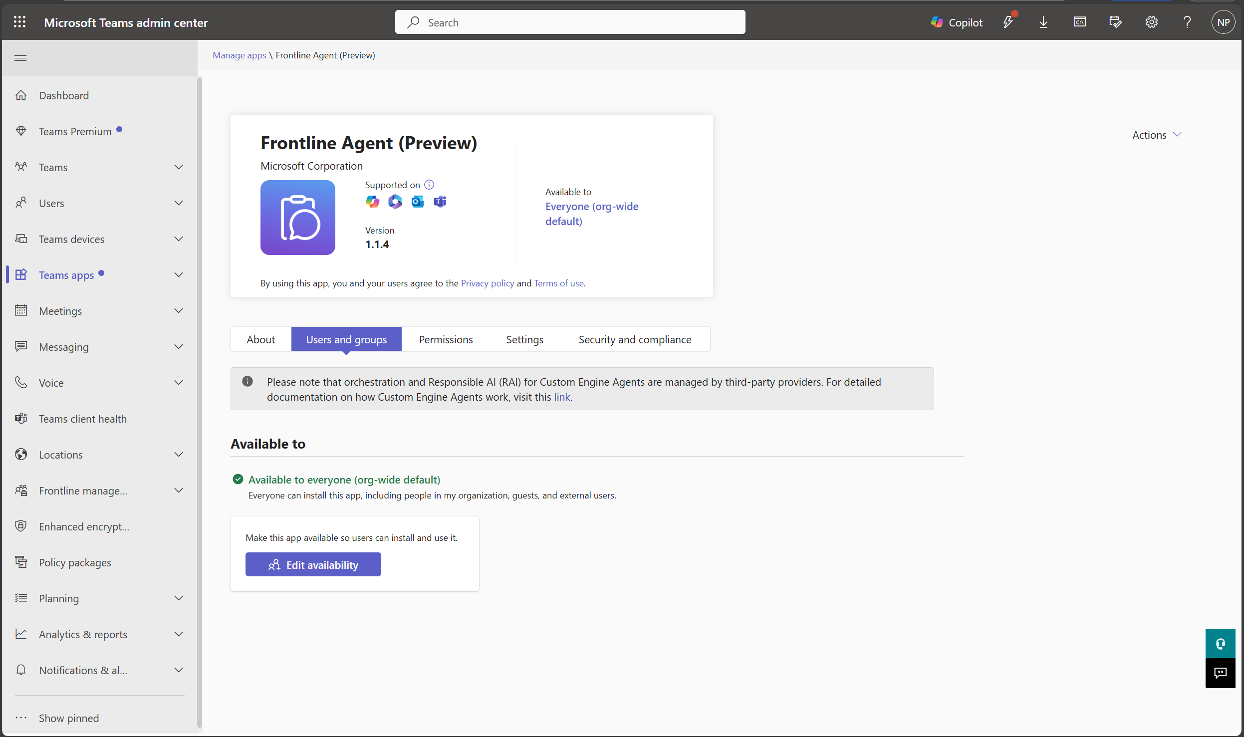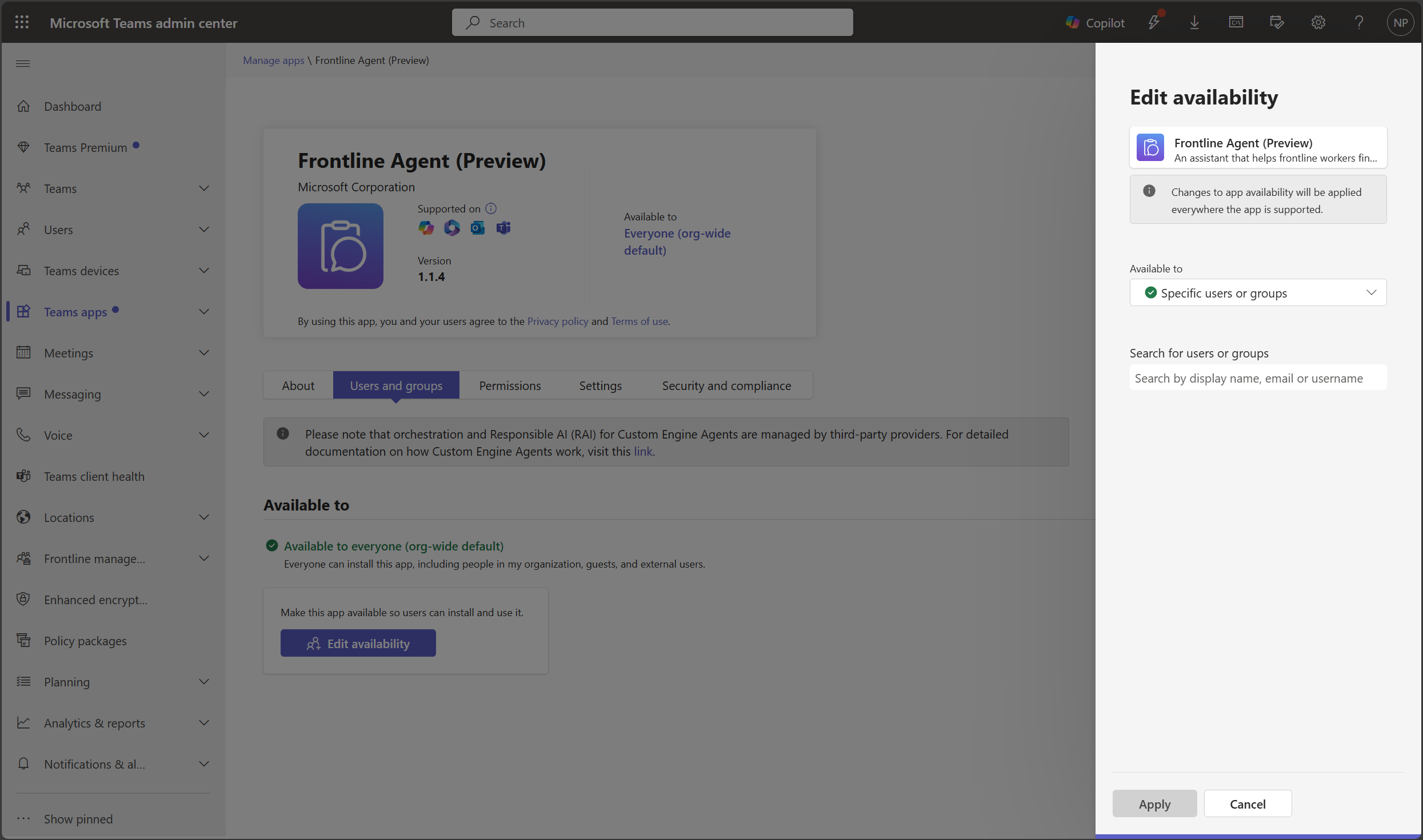 Select Edit availability and specify the set of individuals or Microsoft 365 group you want to deploy the agent to. Click Apply.