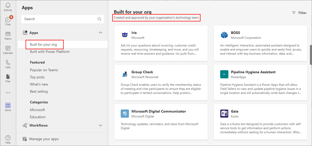 - Browse by apps built for your org and built with Power Platform to discover and install apps in Teams