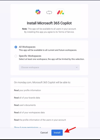 Install the Microsoft 365 Copilot Monday app on your Monday Workspaces via this link.