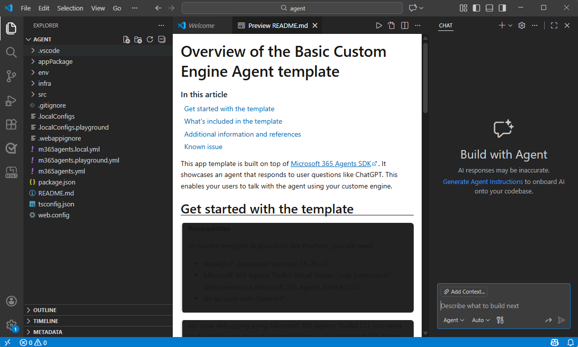 After you create a new Teams agent or app project, the directory structure of the project appears in the left pane and the README file in the right pane.