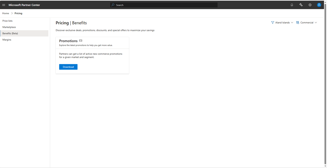 Effective March 11, 2026, to see the latest Cloud Solution Provider (CSP) promotions, from the Partner Center, go to the Pricing workspace. Select Benefits (Beta) from the left navigation.