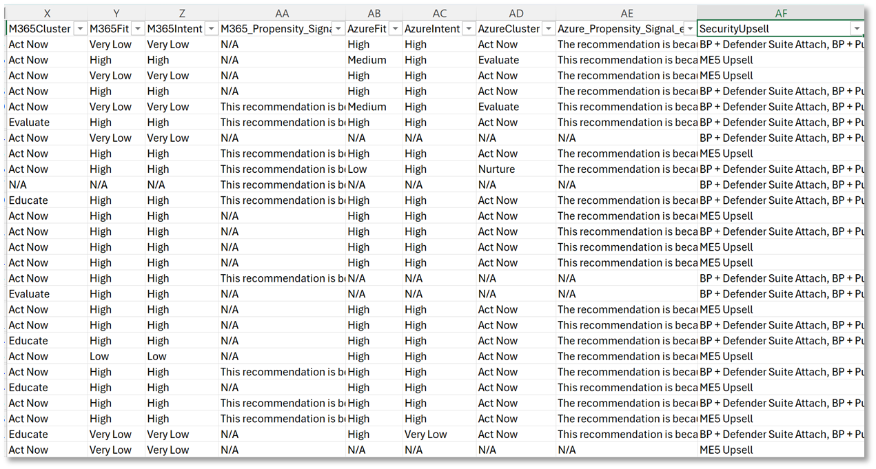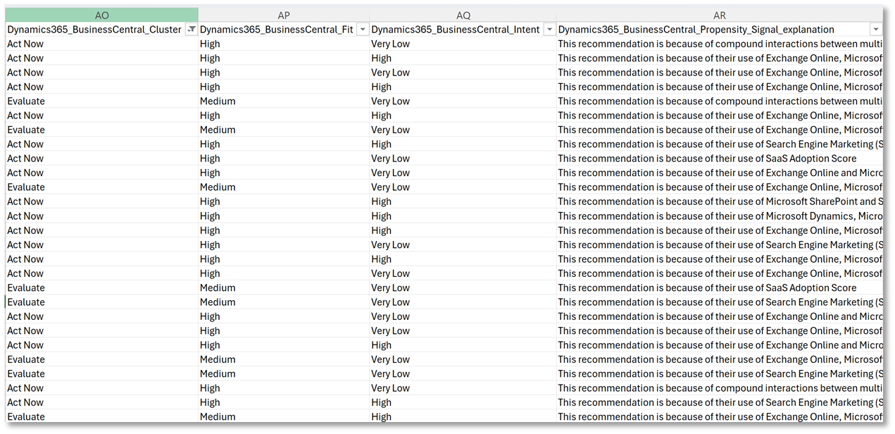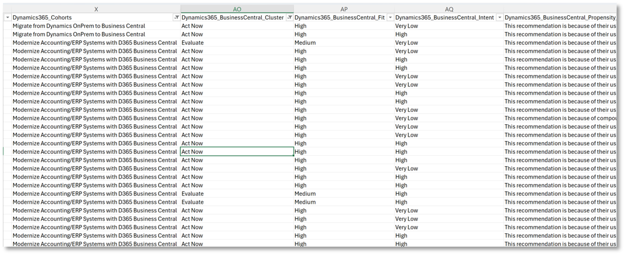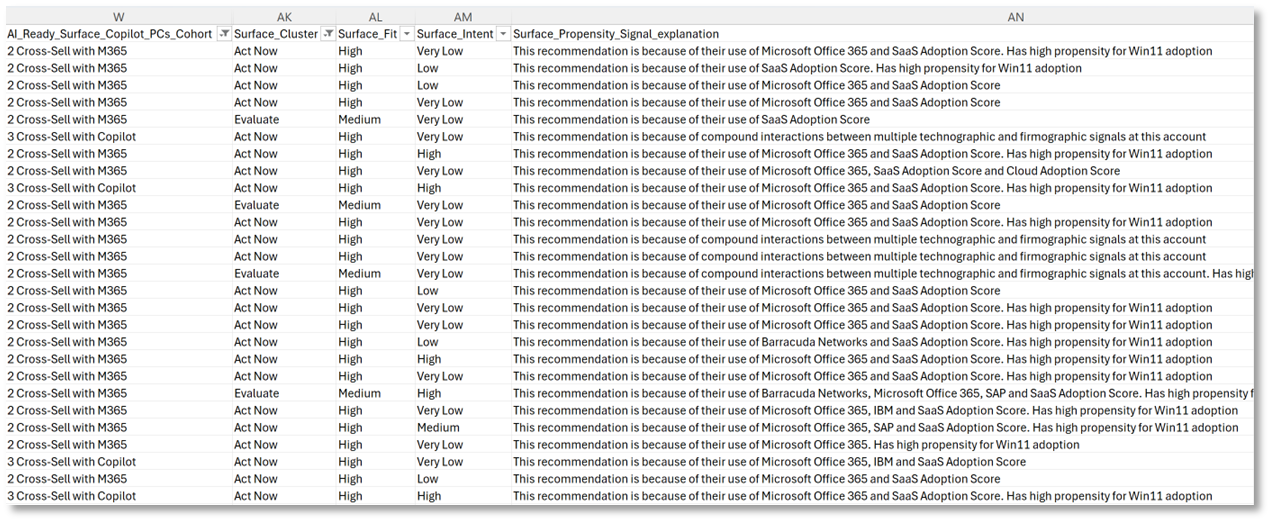 | CloudAscent - AI Business Solutions propensity | Propensity data shows existing transacting customers' likelihood to purchase Microsoft 365, Microsoft 365 CoPilot, Dynamics 365 or Surface products |