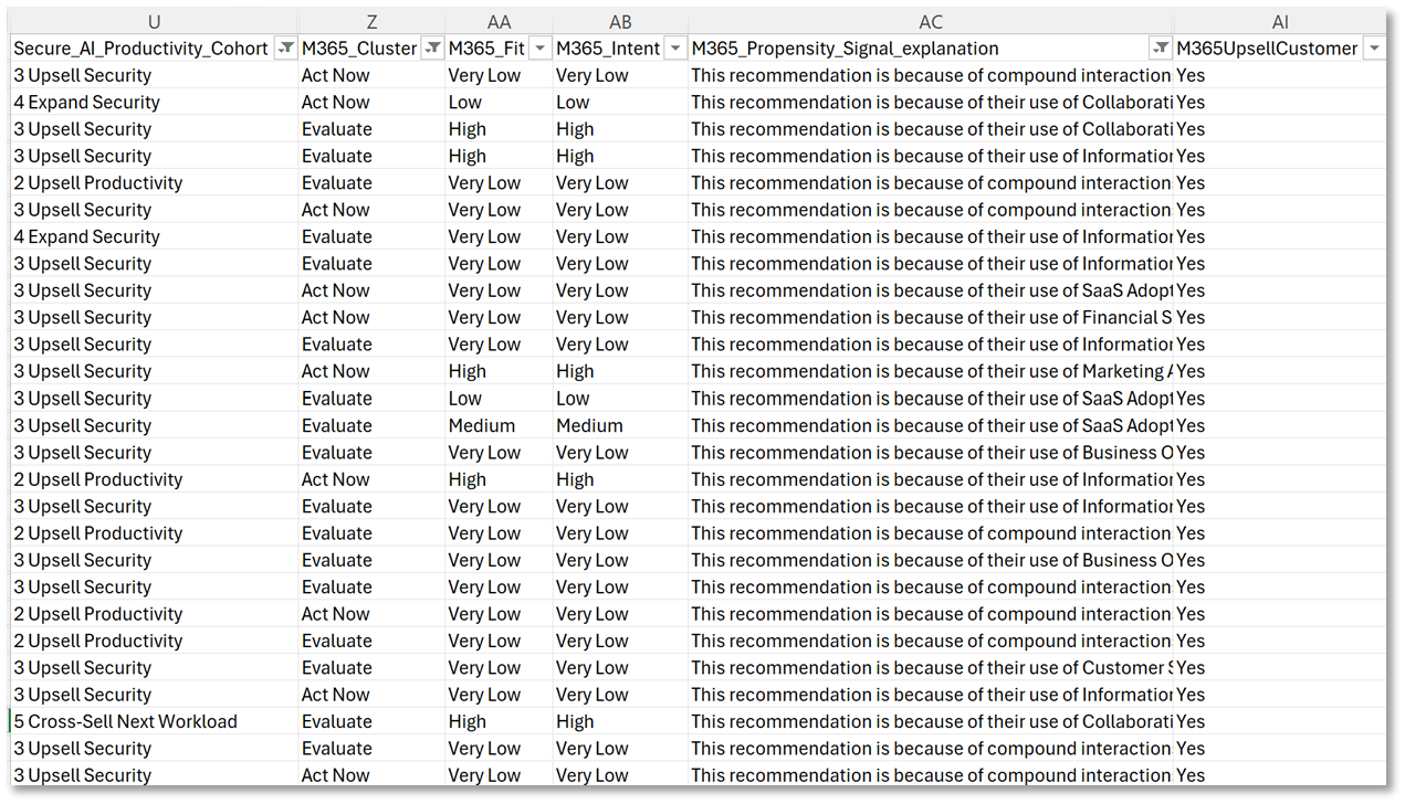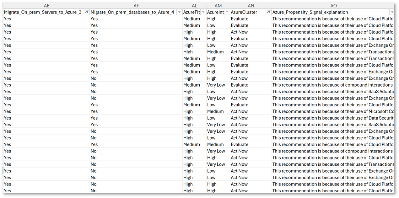 - Scroll to the section on Propensity (Examples: Azure Cluster, M365 Cluster). Filter on Act now, Evaluate to get the high propensity customers. Use the signal explainability to understand why the customer is high propensity.