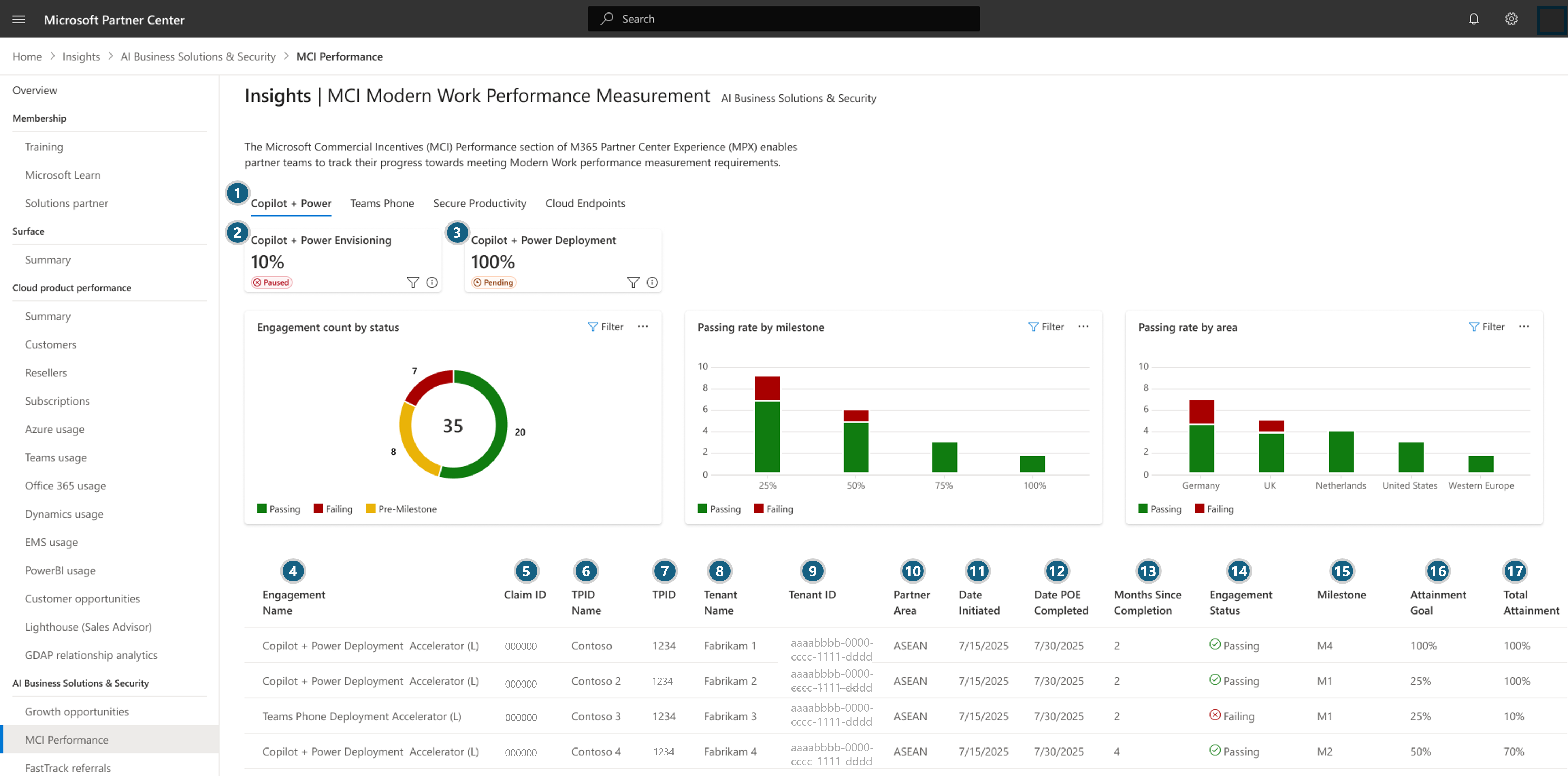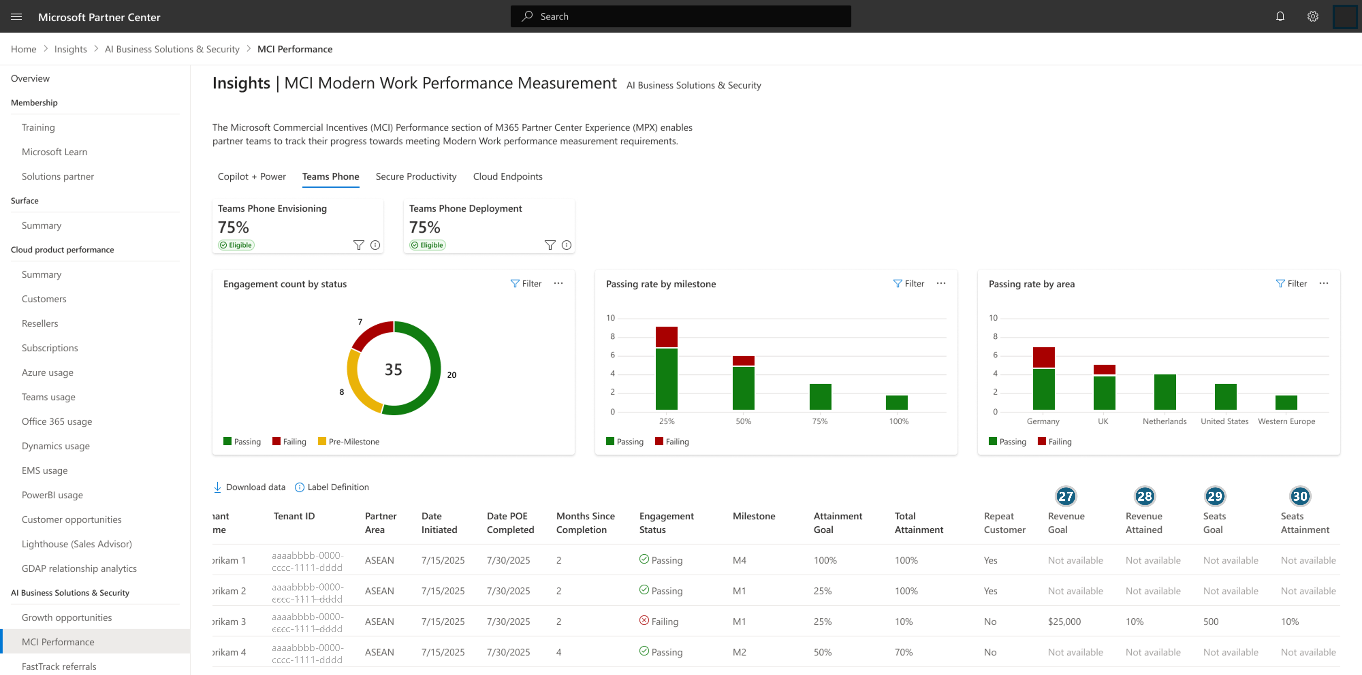 The Microsoft Commercial Incentives (MCI) Performance section of AI Business Solutions & Security Insights enables partner teams to track their progress towards meeting Modern Work performance measurement requirements.