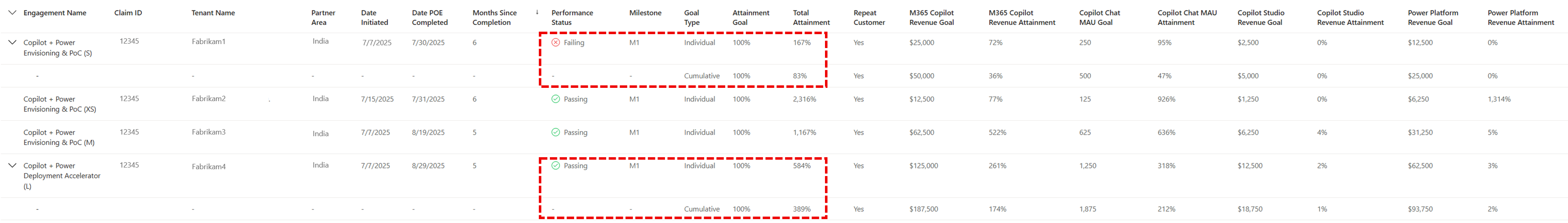To see engagement level progress against performance measurement, the partner must either have a claimed relationship with the customer tenant (for example, Claiming of Partner Record or Cloud Solution Provider) or receive approval from the customer for Microsoft to share performance measurement attainment data with the partner conducting the engagement. The customer provides approval to share this data with the partner through the customer attestation form, which is part of the proof of execution (POE) process. If the customer doesn't agree to share data, the partner will see only aggregated, anonymized data at the engagement portfolio level.